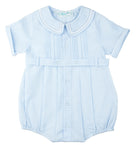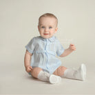 Este conjunto de ropa para bebé es una joya de estilo clásico. Confeccionado en tonos suaves y detalles de ric-rac, pintucks hechos a mano y un cinturón tipo esmoquin, es ideal para ocasiones especiales. El creeper se abre fácilmente con broches en la entrepierna y combina comodidad con un diseño encantador. ¡Un conjunto para bebé que roba todas las miradas!