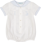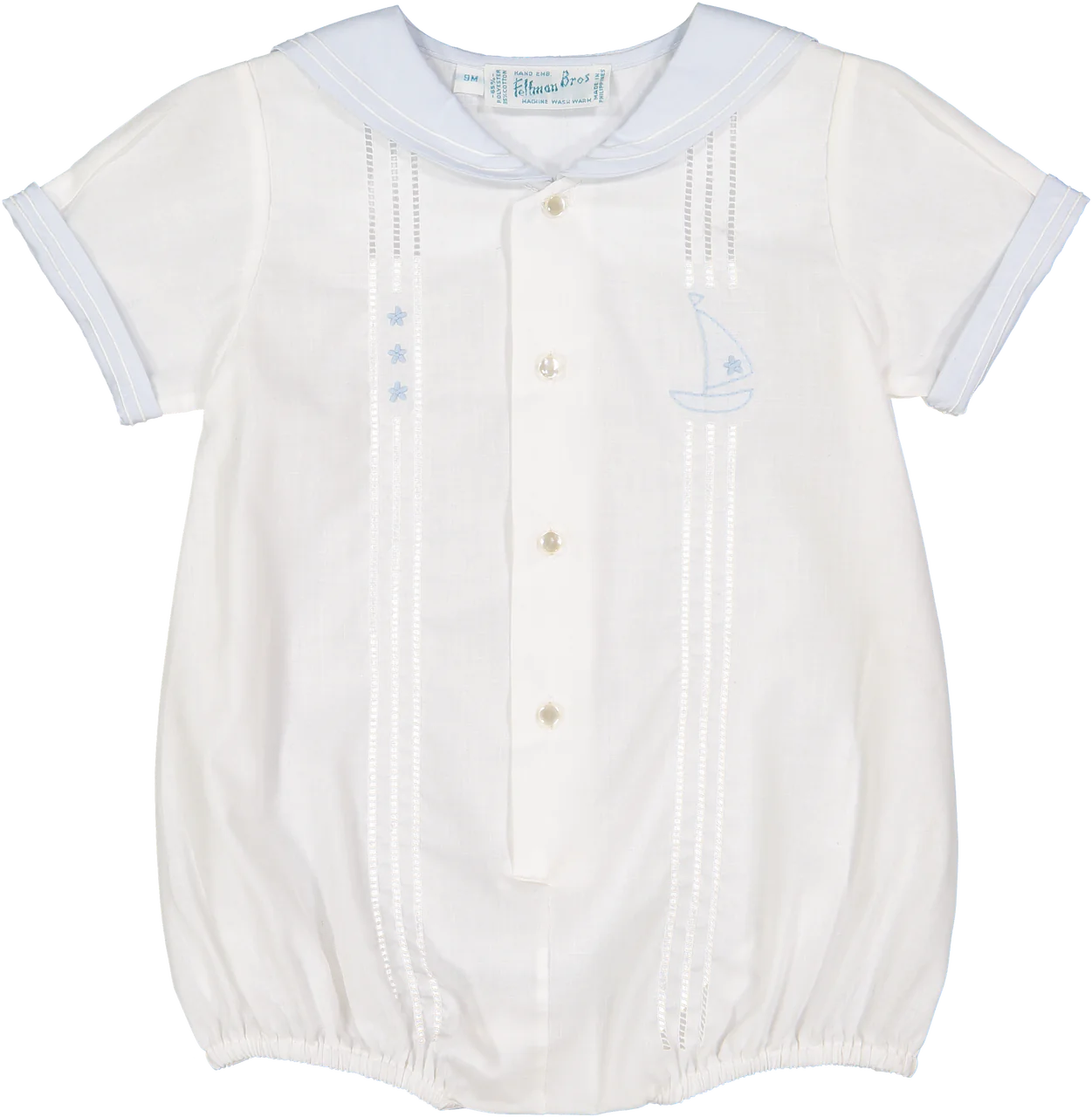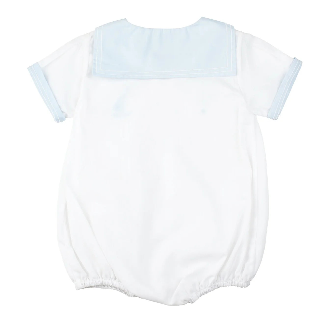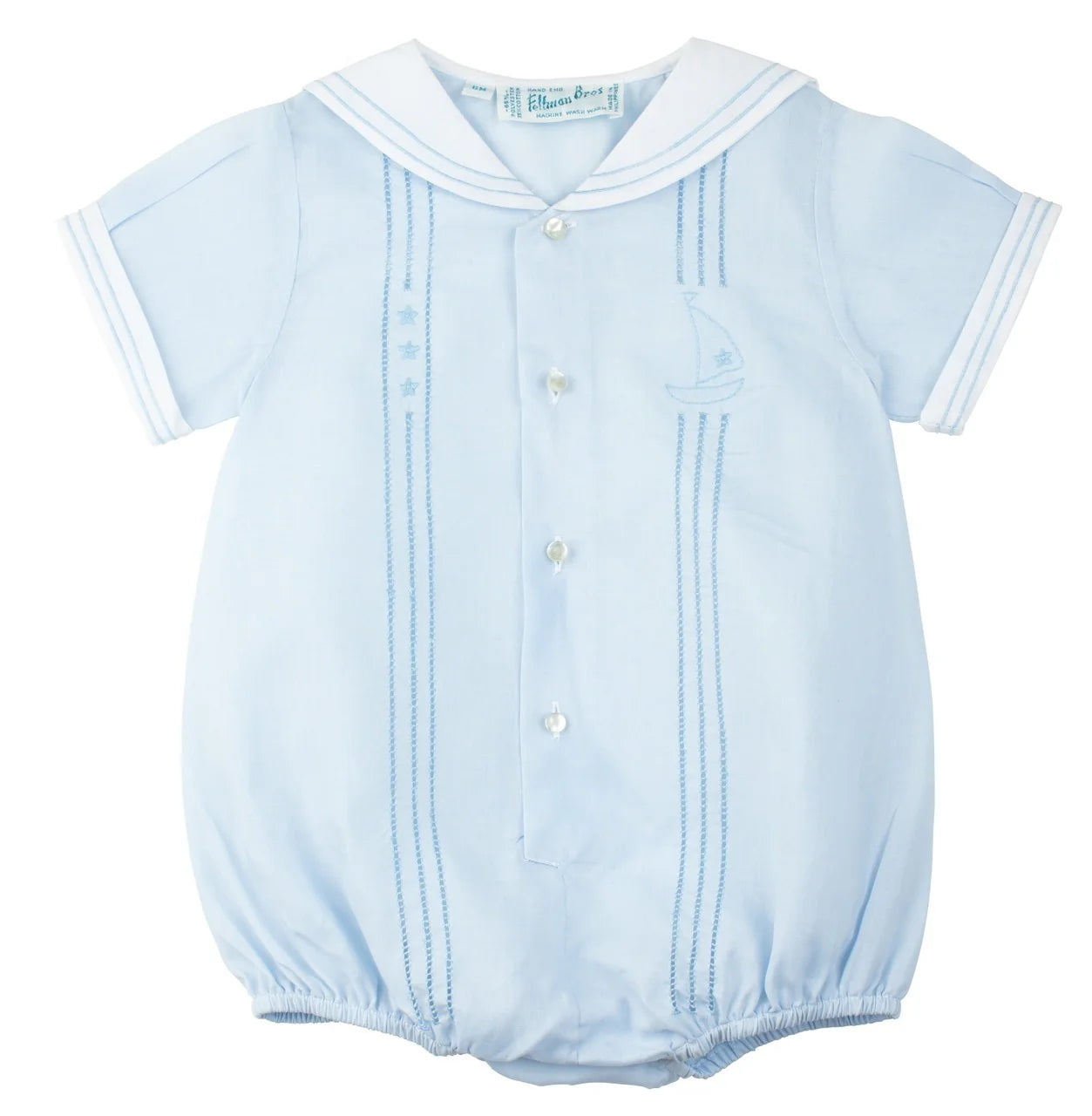 Este enterizo náutico estilo marinero combina encanto y elegancia con su clásico cuello marinero, detalles en los puños y un delicado bordado a mano de un velero y estrellas. Con botones delanteros y broches en la entrepierna, es práctico y cómodo para cualquier ocasión.