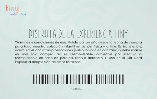 Uso: La gift card es válida únicamente para compras en nuestra tienda de ropa de niños, tanto en tienda física como en línea (según disponibilidad).