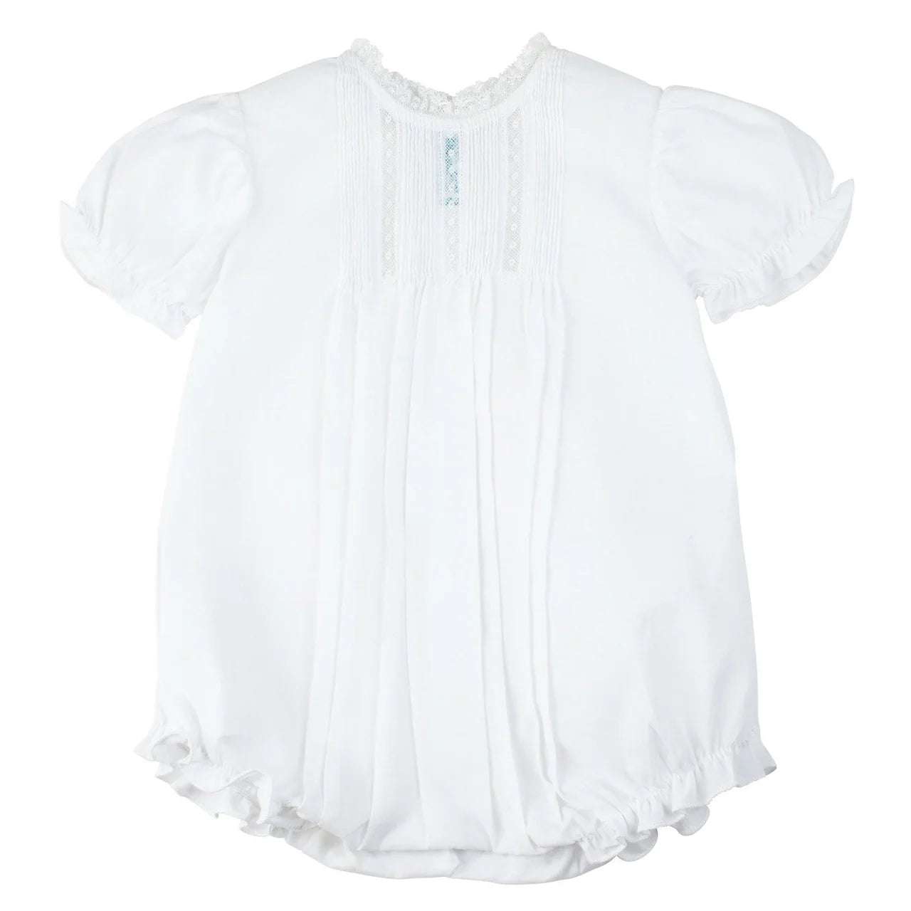 Inspirada en los vestidos para niñas sencillos y elegantes, esta burbujita con encaje francés combina delicadeza y estilo atemporal. Con pliegues pintucks hechos a mano, volantes en mangas y piernas, y un diseño clásico, es perfecta para celebraciones o para añadir un toque especial a su día a día. Una prenda heredable que cautiva corazones.