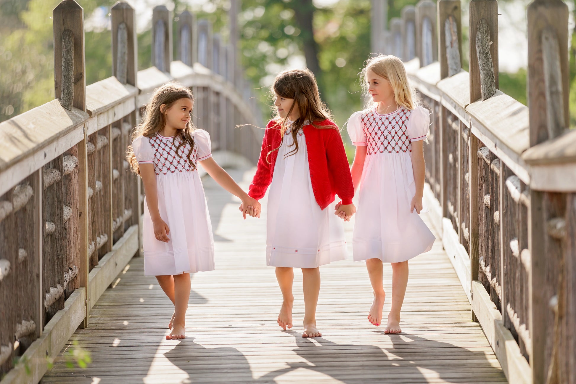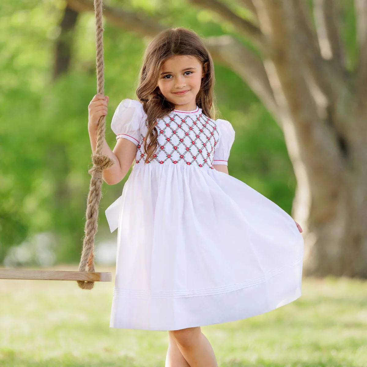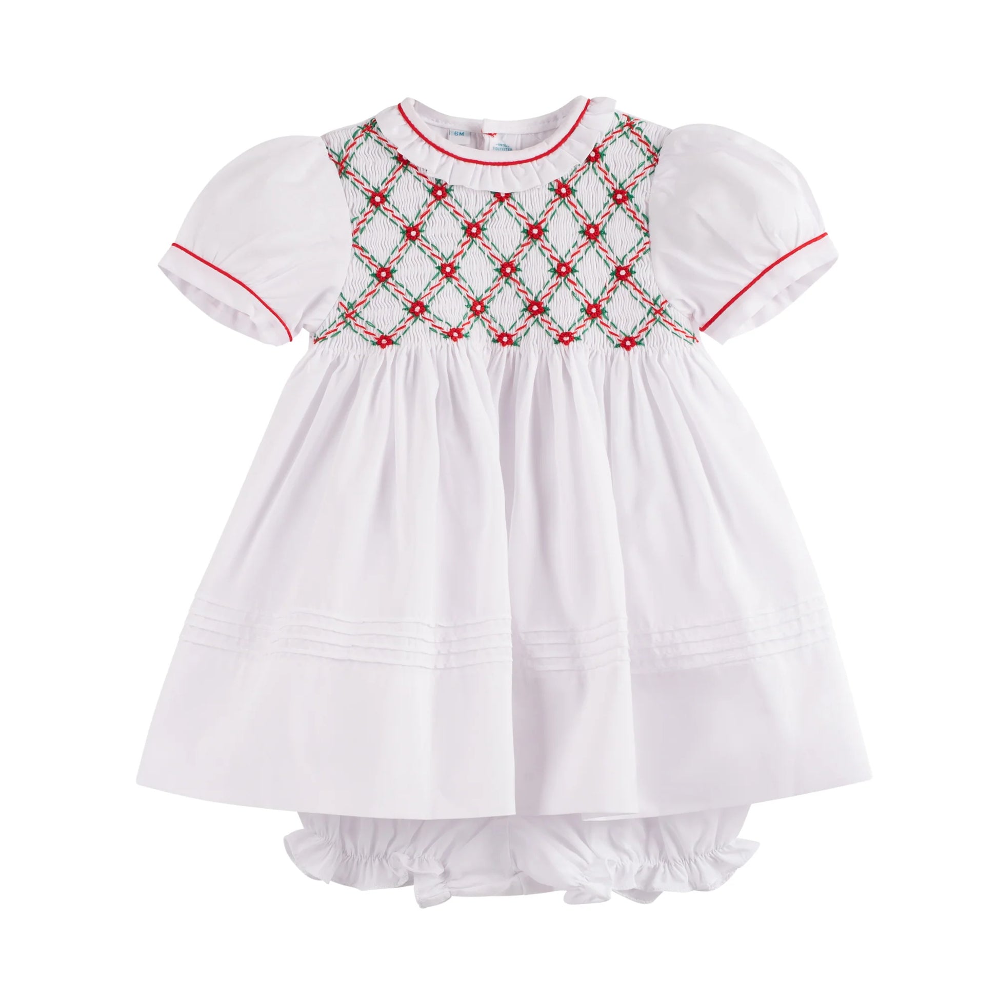 El diseño incluye bordados a mano, ribetes y detalles de nido de abeja en el cuello y los puños, además de pliegues en la falda. Las tallas de 3 a 9 meses incluyen braguita a juego. ¡El conjunto navideño perfecto: atemporal, elegante y de calidad excepcional!