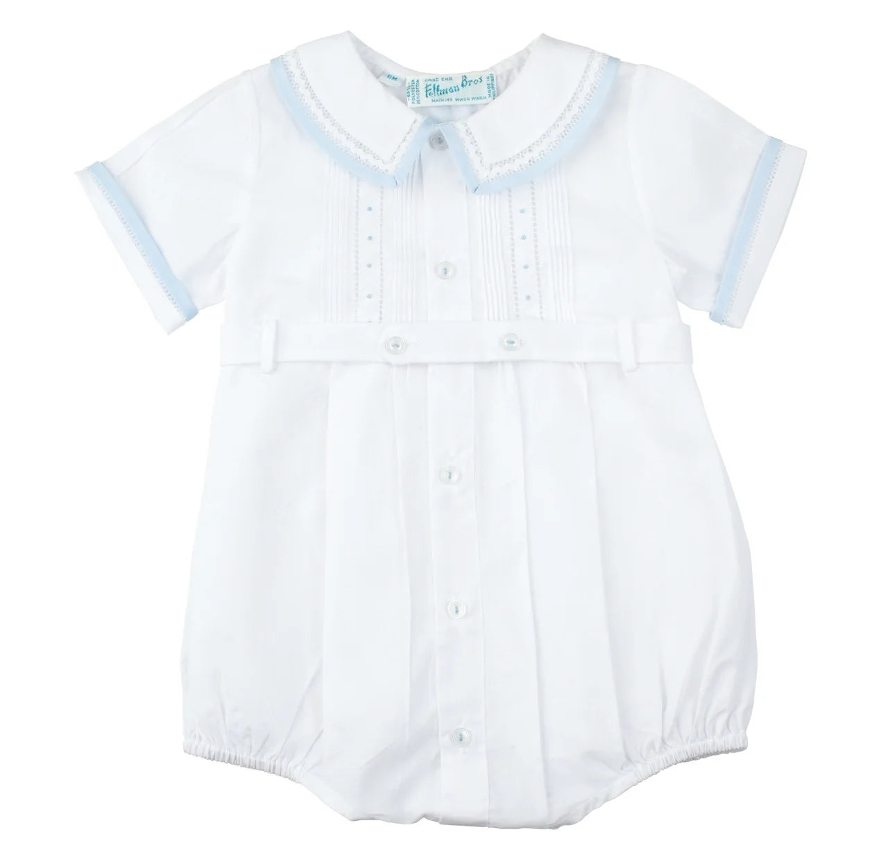 Este conjunto de ropa para bebé es una joya de estilo clásico. Confeccionado en tonos suaves y detalles de ric-rac, pintucks hechos a mano y un cinturón tipo esmoquin, es ideal para ocasiones especiales. El creeper se abre fácilmente con broches en la entrepierna y combina comodidad con un diseño encantador. ¡Un conjunto para bebé que roba todas las miradas!
